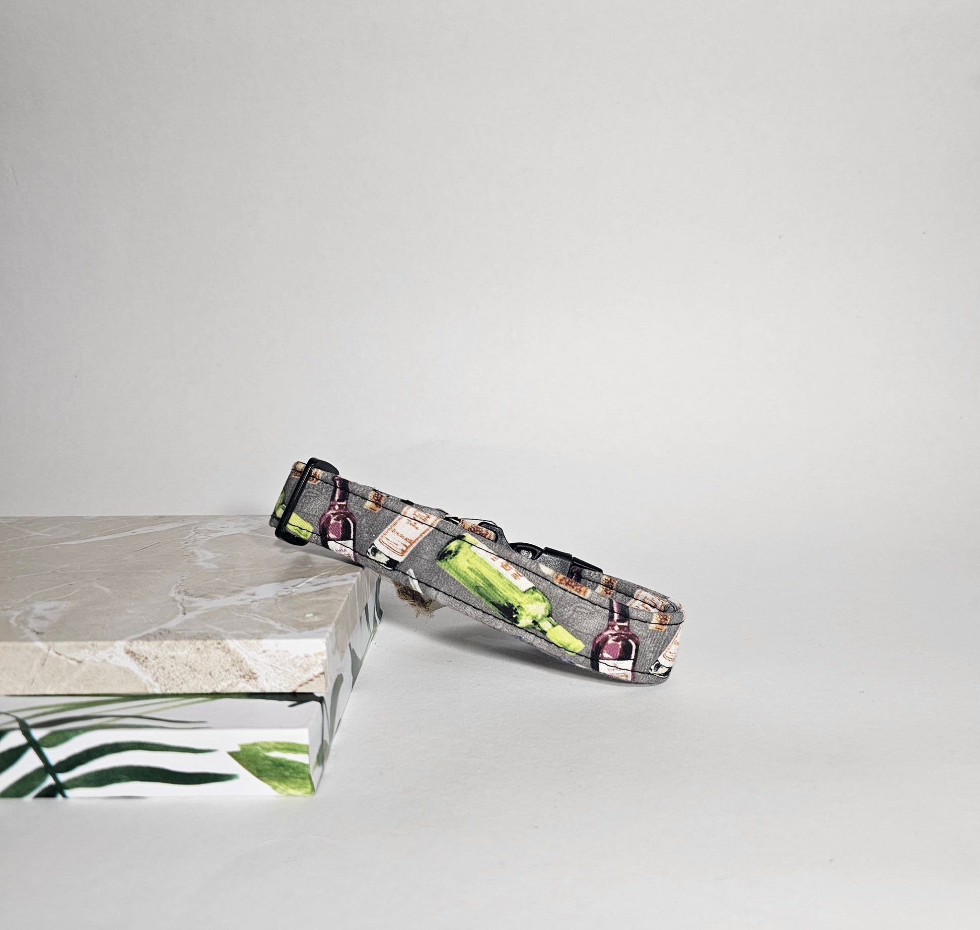 Este collar está hecho con una tela de algodón con patrón de botellas de vino en un fondo gris.