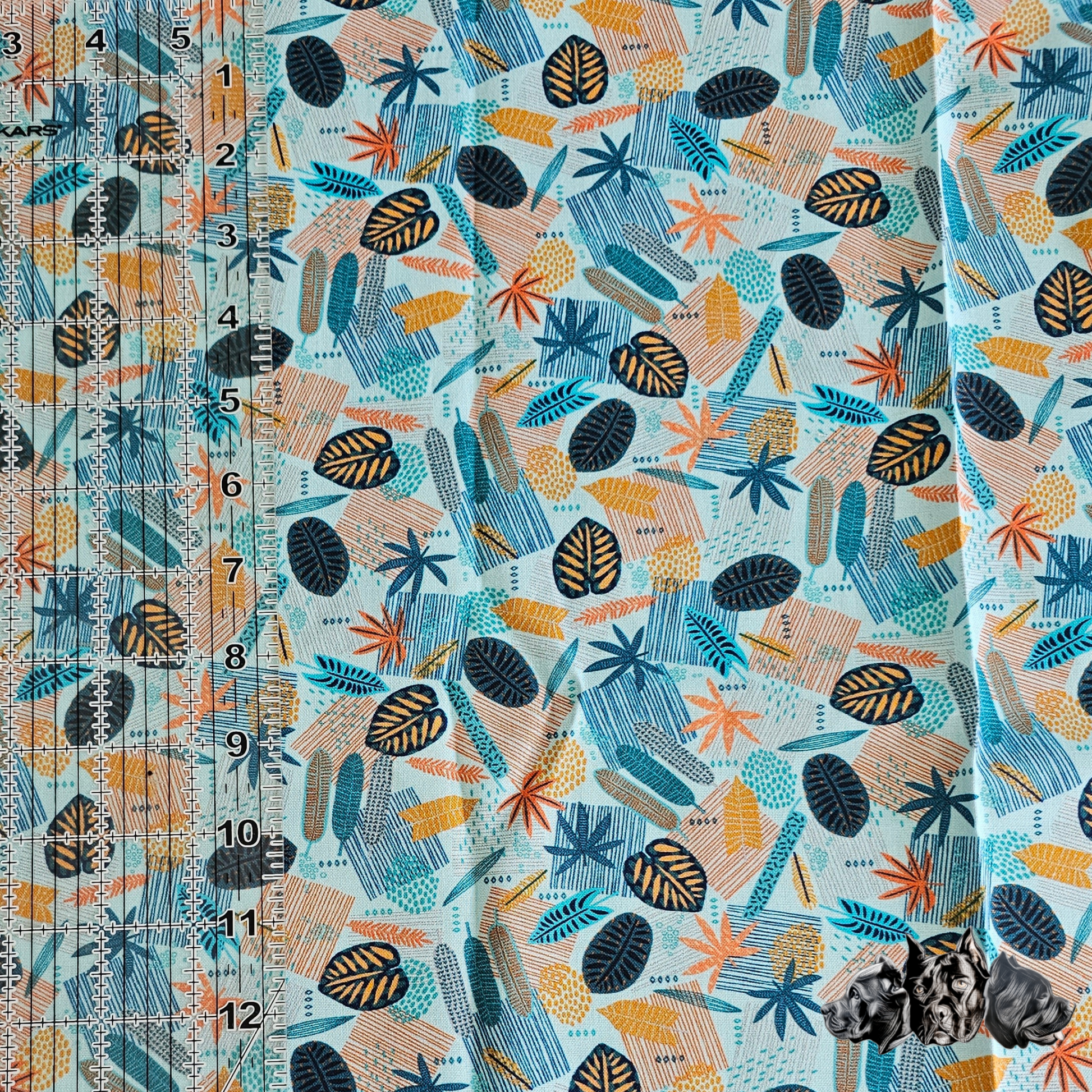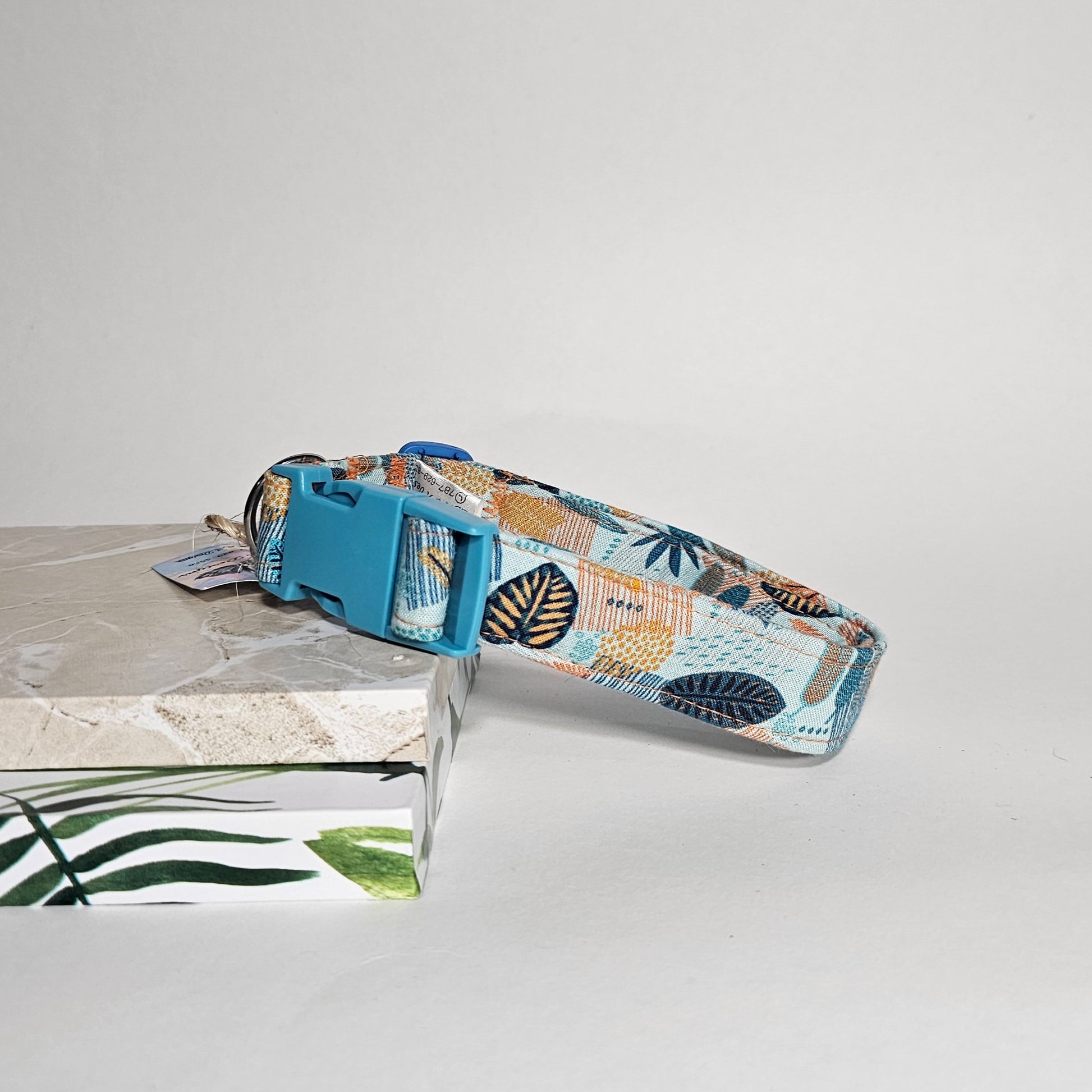 Este es un collar pre-hecho con tela de algodón con un patrón de hojas abstractas en un fondo azul.