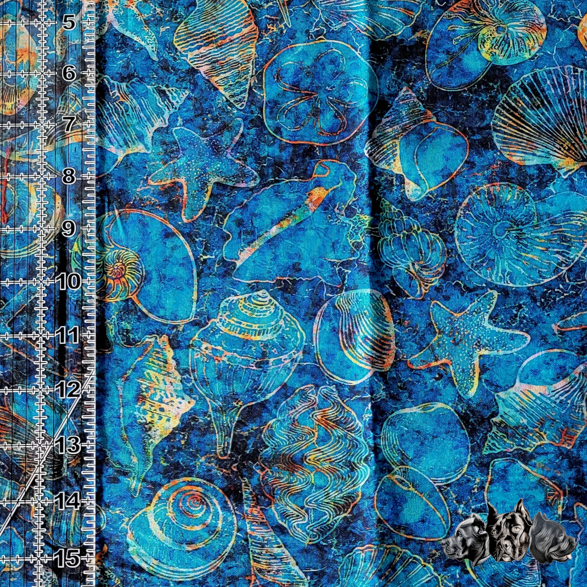 Este es un collar pre-hecho con tela de algodón con un patrón de caracoles en un fondo azul.