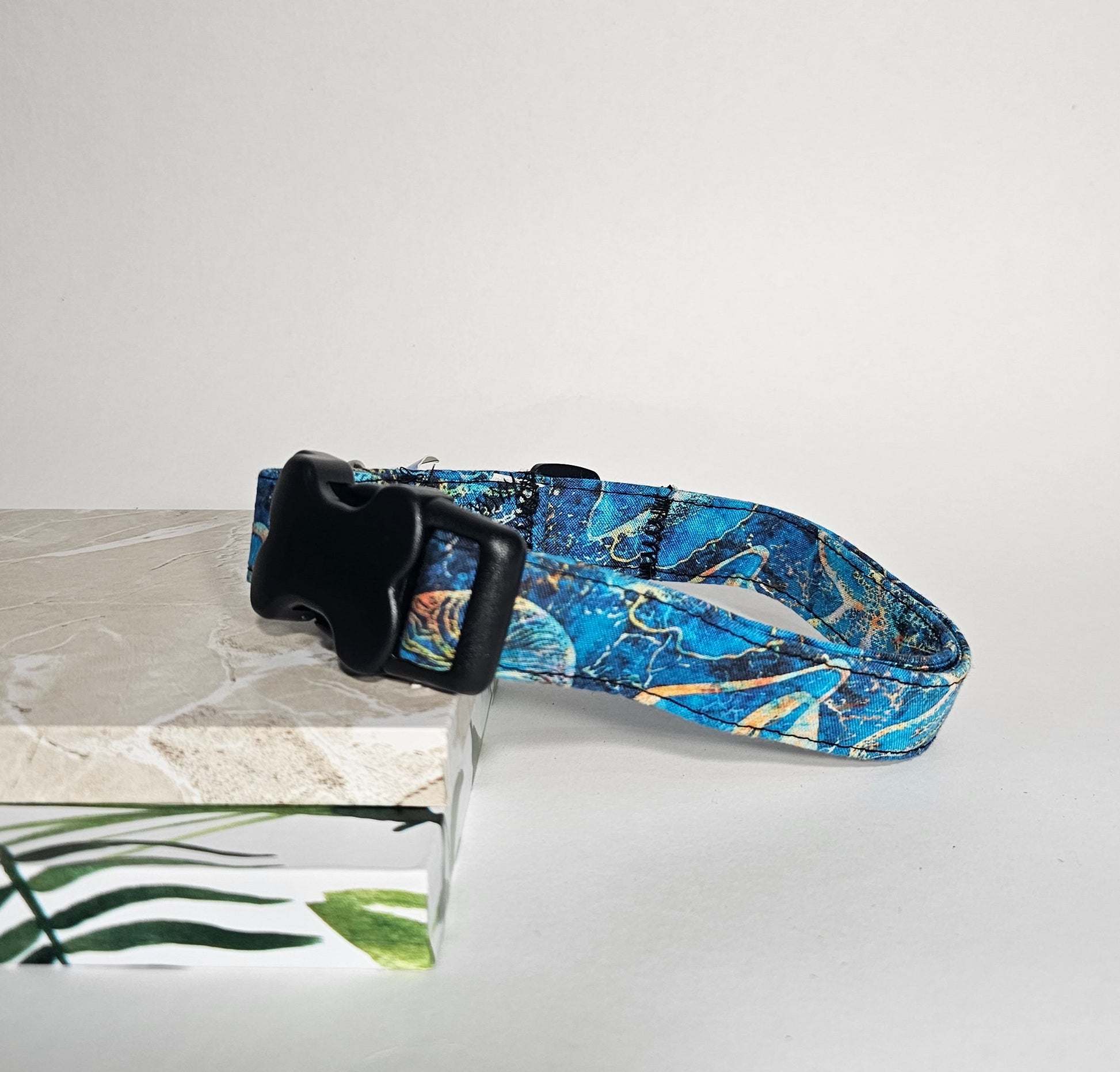 ► El collar esta listo para envío. Esta hecho usando una cinta de nylon revestida con la tela de su elección para brindar soporte y estructura. Cosemos una costura en X en los puntos de tensión para mayor resistencia.