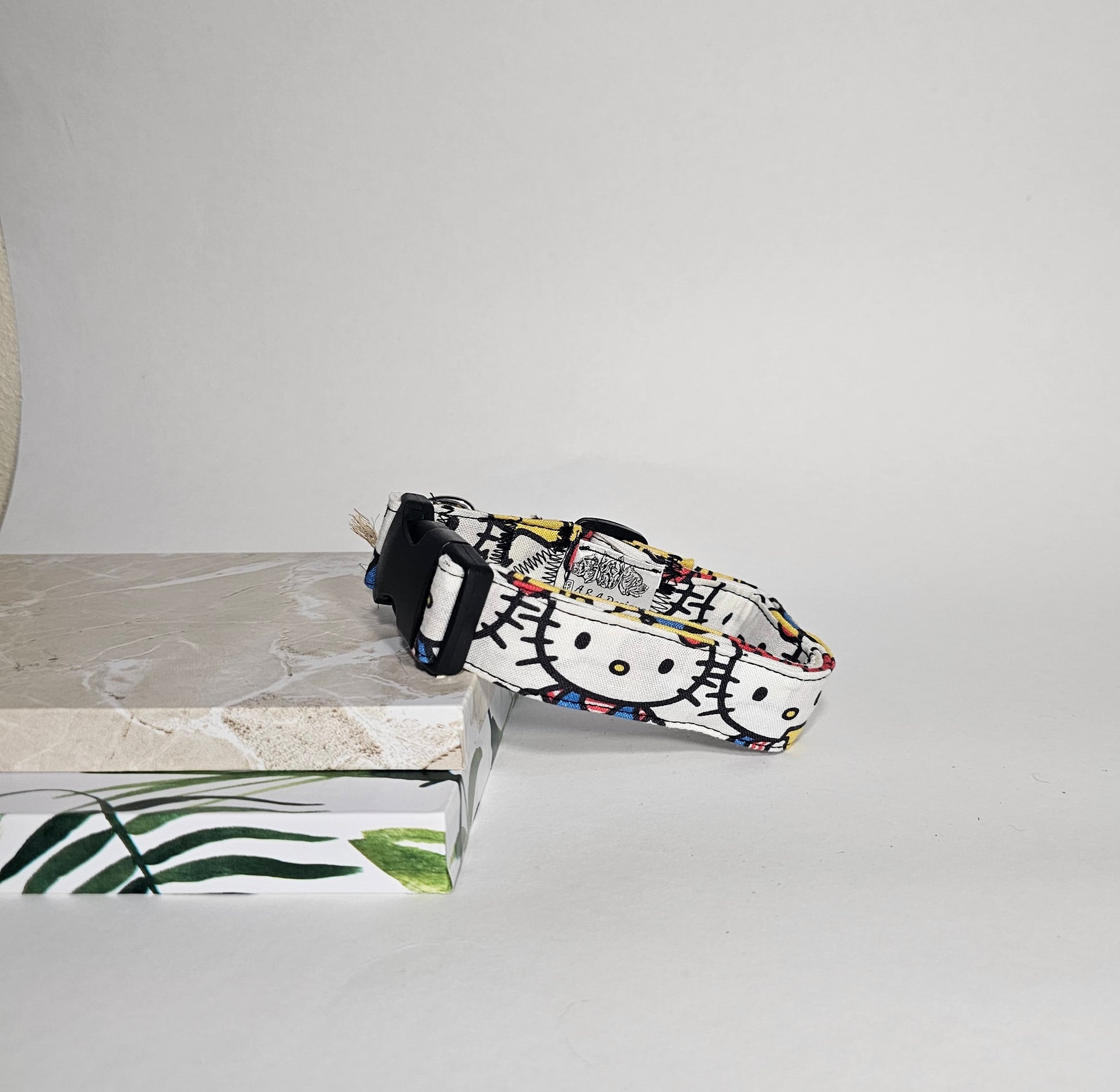 Este es un collar pre-hecho con tela de algodón con estampado de Hello Kitty en un fondo blanco.